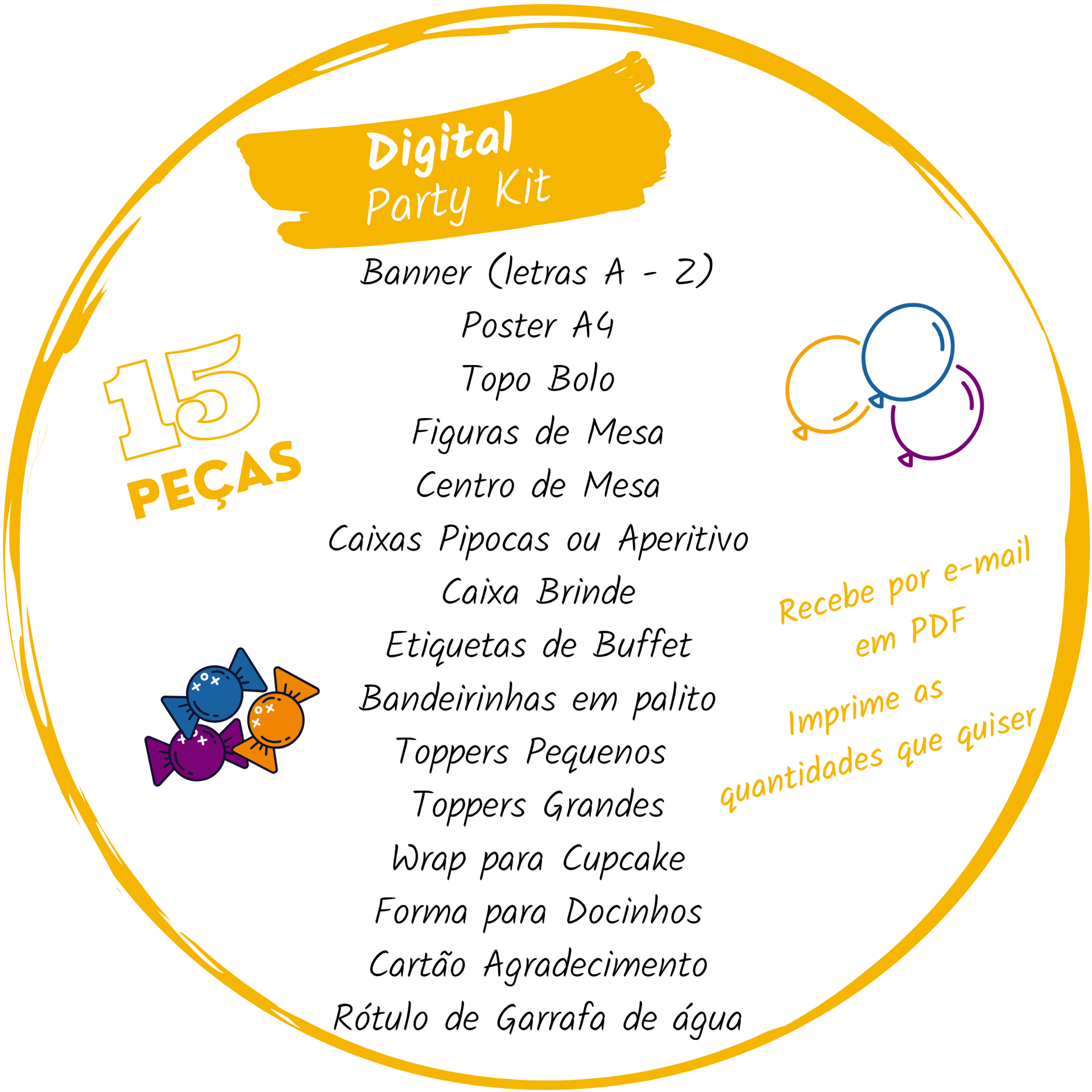 ✨ Digital Party Kit (30€) — Recebe por e-mail e imprime as quantidades que desejar.